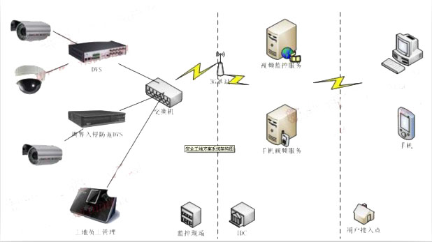 4.實現方式整個方案的實現的基礎是數字式網絡視頻平臺,它可以接收、分發和存儲視頻及其他前端信息,并在上面實現報警聯動和其他處理。同時還還有手機視頻支持、人臉識別考勤和門禁管理系統。在一些工地不方便進行網絡布線時,可采用3G、WIFI等多種無線方式進行網絡接入。